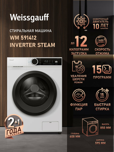 Отдельностоящая стиральная машина Weissgauff, оснащенная инверторным двигателем, работающим по особой технологии BLDC, имеет поистине фантастический показатель загрузки до 12 килограммов белья и внушительную скорость отжима до 1400 оборотов в минуту - это гарантия по-настоящему высокого результата при каждом запуске цикла стирки вашего белья. Technologic Motor BLDC (Brush Less Direct Current) - двигатель, построенный по особой технологии, использующей электромагнитное поле для вращения барабана (без применения щёток), что значительно снижает уровень шума, износа и энергопотребления. 10 лет гарантии на инверторный двигатель - это живое подтверждение немецкой уверенности Weissgauff в качестве выпускаемой нами продукции! Функция "Пар" - это инновационное решение от компании Weissgauff, которое позволит придать свежести вещам, а также устранить неприятный запах, легкие загрязнения и складки на одежде, бережно сохраняя при этом структуру волокон ткани. При выборе данной функции, пар добавляется ближе к середине цикла программы стирки белья, на этапах стирки и полоскания. Режим "Быстрая стирка" 15 минут - это по-настоящему фантастическая программа для тех, кто умеет ценить своё время! Функция "Моя программа" позволит создать и сохранить в память машины новый режим работы с бельём, на основе выбранных вами параметров. Режим очистки барабана обеспечит максимальную простоту в уходе за стиральной машиной, сохраняя ваше время и силы для более важных дел. Загрузка до 12 килограммов - это поистине впечатляющий показатель для стиральных машин, благодаря которому вы справитесь за один цикл со всем необходимым объёмом одежды. Скорость отжима до 1400 оборотов в минуту позволит существенно сократить время на дальнейшую сушку вашего белья. Режим для детских вещей добавляет дополнительное полоскание, что особо важно при защите нежной кожи от остатков моющего средства. Класс энергоэффективности A+++ - это поистине высокий уровень качества Weissgauff, который позволяет с уверенностью говорить о том, что данная стиральная машина обеспечит отличный результат при каждой стирке белья, затрачивая при этом минимум электроэнергии. Таймер отложенного старта, благодаря которому вы сами можете выбирать время начала работы с отсрочкой от 0 до 24 часов Чувствительное сенсорное управление - это настоящая гордость Weissgauff, ведь оно реагирует на все ваши команды с первого прикосновения. Функция дозагрузки белья даст возможность отправить в стирку те вещи, которые вы забыли или не успели заложить внутрь, даже после запуска программы. Блокировка от детей защитит вашу стиральную машину от нарушения работы программы вследствие непреднамеренных нажатий кнопок или поворотов переключателя. Обратите внимание, что размер глубины стиральной машины в таблице технических характеристик указан по корпусу без учета выступающих элементов.