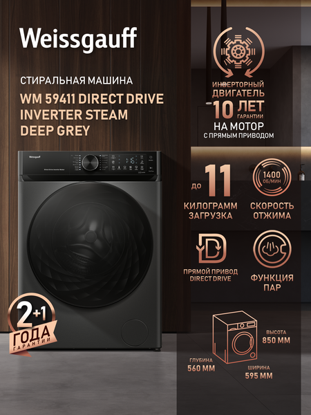 Отдельностоящая стиральная машина Weissgauff выполненная в тёмно-сером цвете, оснащенная прямым приводом, инверторным двигателем работающим по особой технологии BLDC и функцией пара, имеющая показатели загрузки до 11 кг белья и скорости отжима до 1400 оборотов в минуту - это настоящее качество по разумной цене! Прямой привод Direct Drive - позволяет стиральной машине работать без ременного передаточного механизма, что обеспечивает существенно более низкий шум и вибрацию в ходе работы устройства, а также повышенную долговечность и вместимость загрузки белья. Качество стирки в машине, оснащенной прямым приводом, также становится более высоким! Инверторный двигатель Technologic Motor BLDC (Brush Less Direct Current), построенный по особой технологии, использующей электромагнитное поле для вращения барабана (без применения щёток), что значительно снижает уровень шума, износа и энергопотребления 10 лет гарантии на инверторный двигатель с прямым приводом - это живое подтверждение немецкой уверенности Weissgauff в качестве выпускаемой нами продукции! Функция "Пар" - это инновационное решение от компании Weissgauff, которое позволит придать свежести вещам, а также устранить неприятный запах, легкие загрязнения и складки на одежде, бережно сохраняя при этом структуру волокон ткани. При выборе режимов, имеющих в своем цикле данную функцию, пар добавляется в ходе цикла в процессе работы программы! Класс энергоэффективности A+++ позволяет с уверенностью говорить о том, что данная стиральная машина обеспечит отличный результат при каждой стирке белья, затрачивая при этом минимум электроэнергии! Загрузка до 11 килограммов - благодаря которой вы справитесь за один цикл со всем необходимым объёмом белья! Скорость отжима до 1400 оборотов в минуту позволит существенно сократить время на дальнейшую сушку вашего белья! Режим Быстрая стирка 15' минут - это по-настоящему фантастическая программа для тех, кто умеет ценить своё время и предназначена для стирки повседневной, тонкой одежды, которая не сильно загрязнена. Режим Быстрая стирка 42' минуты - подходит для разных типов тканей со средним уровнем загрязнения и обеспечивают максимальную чистоту и эффективность стирки. Режим Гигиена -используется для длительной стирки при высокой температуре; подходит для одежды, постельных принадлежностей и мягких игрушек, принадлежащих людям, склонным каллергии, или обладателям сверхчувствительной кожи. Режим Спорт в стиральной машине предполагает выбрать температуру воды в барабане, небольшую скорость вращения и быстрый отжим. Этот режим направлен на сохранение технологичных материалов, из которых изготовлена спортивная одежда. Режим Детская стирка в стиральной машине предназначен для бережного ухода за вещами малышей. Он предусматривает несколько циклов полоскания, за счет чего остатки порошка полностью удаляются из волокон ткани. Кроме этого, вода в баке прогревается до максимально возможной температуры, обеспечивая высокое качество очистки. Режим Моя программа удобен, когда нужно сократить время стирки и подобрать процесс стирки под свой вкус. Созданная программа сохраняется в памяти стиральной машины, и при следующей стирке её можно будет включить. Тихий режим станет идеальным решением для стирки в ночное время. После его активации все электронные звуковые сигналы будут отключены, 