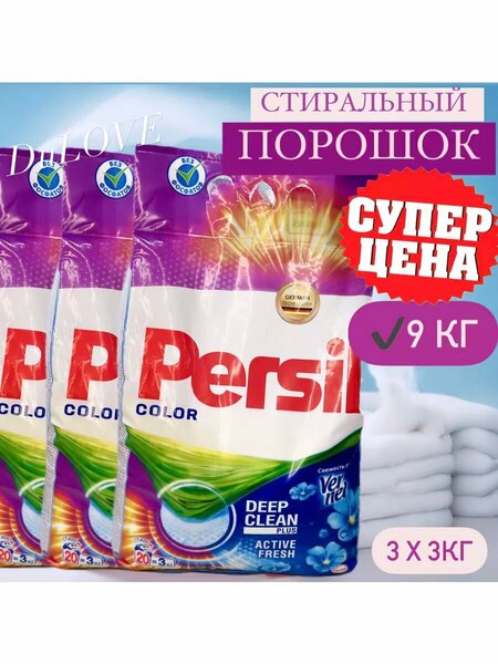 Стиральный порошок Persil Color Персил колор со свежестью от вернель vernel 9 кг (3 шт по 3 кг) Предназначен для стирки цветного белья. -безупречное удаление пятен с первой стирки даже при 30°C; - порошок быстро растворяется, не оставляя следов на одежде; - сохраняет яркость цветных вещей; - помогает справиться с застарелыми пятнами; - не дает грязи и пятнам въедаться в структуру волокон; - 0% фосфатов и хлорного отбеливателя. Благодаря технологии Аквапудра, порошок для стирки Persil Color растворяется, едва коснувшись воды, и моментально активируется: глубоко проникает в структуру волокон и удаляет сложные пятна, не давая загрязнениям въедаться. Порошок Persil Color удаляет даже невидимые загрязнения, устраняя неприятные запахи и предотвращая изменение цвета ткани, в том числе на воротничках и манжетах.