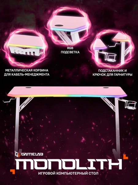 Стол компьютерный GAMELAB Monolith Pink&White - это сочетание стиля, функциональности и качества. Стол оборудован RGB подсветкой, которая регулируется с помощью пульта дистанционного управления. Вы можете выбрать из 22 различных режимов и 20 статичных цветов, создавая уникальную атмосферу в вашем помещении. Стол имеет прочную конструкцию с фиксированной стальной рамой в основании, что обеспечивает надежность и долговечность. Столешница выполнена из высококачественного ЛДСП толщиной 18 мм и покрыта высокопрочным углеродным волокном, что делает ее устойчивой к царапинам и повреждениям. Встроенные кабель-каналы позволяют удобно расположить провода, а металлическая корзина для кабель-менеджмента с обратной стороны обеспечивает порядок и организованность. Стол оснащен подстаканником и крючком для гарнитуры, что делает его еще более функциональным и удобным в использовании. GAMELAB Monolith Pink&White - это не просто стол, это стиль, функциональность и качество, которые сделают вашу игру еще комфортнее и приятнее.