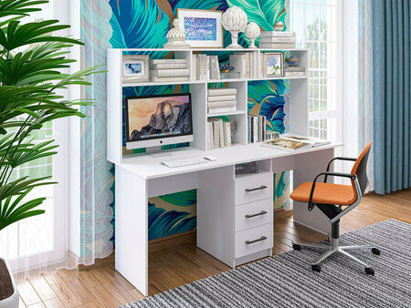 Стол с надстройкой на два рабочих места «СК-58»; ВхШхГ: 1500х1740х600мм; Простота при полном функционале и безупречном качестве. Данная модель оснащена: большой рабочей площадью, столешница прямая, разделительная тумба с четырьмя ящиками полного выдвижения (шариковые направляющие) и шесть вместительных ниш, верхняя часть надстройки образует дополнительную полку. Изделие МФ «Пирамида» выполнено из высококачественного, износостойкого и экологичного материала – ЛДСП класса Е1, толщиной 16мм. Края обработаны ударопрочной кромкой ПВХ, что значительно увеличивает срок эксплуатации изделия. Для сборки используется фурнитура от ведущих мировых производителей. Все изделия фабрики сертифицированы и абсолютно безопасны для здоровья.