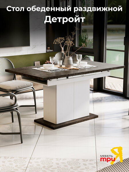 Стол обеденный Детройт идеально впишется в Вашу кухню, оформленную в современном стиле, его линии отличаются четкостью и определенностью, лаконичностью и привлекательностью. Кухонный стол является современным и универсальным решением оформления обеденного места. Опора раскладного стола имеет дополнительное место для хранения с механизмом открывания дверцы - push-to-open. Качественные материалы делают стол для кухни износостойким, способным прослужить многие годы - используется высококачественный безопасный ЛДСП. Размеры: высота - 77 см, длина 150,4 см, длина в разложенном виде - 201,4 см, ширина 85 см, механизм раздвижения - синхронный раздвижной с цельной вставкой (укладывается вручную). Разместит за собой 6-10 человек. Поставляется в разобранном виде. Все технические отверстия сделаны на производстве, фурнитура для сборки и инструкция идет в комплекте.