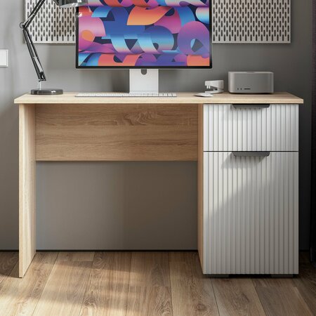 Письменный стол Норд СТП03-1200 – компактное, но удобное рабочее место для подростка школьника или взрослого. Отлично подойдёт в квартиру или загородный дом, офис. Можно разместить в спальню, гостиную, детскую комнату в современном стиле (лофт, скандинавский, минимализм). Компьютерный стол Норд имеет универсальную сборку, т. е. тумба может быть расположена как с левой, так и с правой стороны (собираете по своему желанию). Стол имеет стандартную рабочую поверхность столешницы – 120х55 см. Оборудована 1 тумбой, в которой имеются: 1 ящик и 2 полки за распашной дверцей. В ней можно хранить канцелярские принадлежности, документы, бумаги и прочие предметы. Размеры: ширина – 120 см, высота – 75 см, глубина – 55 см. Материал: корпус – ЛДСП, фасад – МДФ (рельефный, рифленый), ручки - металл. Цвет: корпус – дуб сонома, фасад – софт пломбир line. Ящик: полного выдвижения, на шариковых направляющих. Сборка: универсальная. Максимально допустимая нагрузка: на столешницу – 15 кг, на полки – 8 и 15 кг на верхнюю и нижнюю соответственно. Письменный стол Норд станет элементом сквозной коллекции или дополнит самостоятельный интерьер.