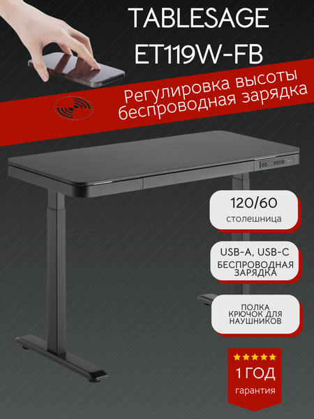 TableSage Et119W-FB: Переосмыслите свое рабочее место. Комфорт Здоровье и стиль в каждой детали. 2025 год приносит революцию в ваш офис и дом — TableSage Et119, письменный стол с электрической регулировкой высоты, созданный для тех, кто ценит здоровье, технологичность и удобство. Почему ваш позвоночник скажет вам «спасибо»? • Регулировка высоты (720–1200 мм): Работайте сидя, стоя или даже в движении! Всего одно нажатие — и стол адаптируется под вас, снижая нагрузку на спину, улучшая осанку и кровообращение. Больше никакой скованности и усталости к концу дня. • 4 памяти положений: Сохраните идеальные настройки для работы, творчества, отдыха или видео звонков. Меняйте позу легко — ваш организм оценит динамику! Технологии, которые заботятся о вашем комфорте: • Беспроводная зарядка Qi + USB-C/USB-B: Никаких проводов под ногами. Просто положите телефон или ноутбук на стол — устройство заряжается само. Меньше хаоса — больше сосредоточенности. • Встроенный лоток для ноутбука и мелочей: Больше не надо наклоняться, чтобы достать гаджеты. Всё под рукой, а стол остается свободным для работы. • Крючок для наушников: Больше не ищите их в спешке. Удобно, эргономично, без лишних движений. Прочный. Универсальный. Ваш. • Жесткая конструкция: Даже на максимальной высоте стол устойчив — никакой тряски, только уверенность в каждом движении. • Столешница 1180×600 мм: Достаточно места для мониторов, документов и чашки кофе. Идеально для дома, офиса или гибридного графика. TableSage Et119 — это не просто стол. Это инвестиция в здоровье, продуктивность и гармонию. Устали от боли в спине? Пора менять правила игры. Закажите TableSage Et119 сегодня и почувствуйте, как работа становится вдохновением, а не нагрузкой. Ваше тело заслуживает большего. Подарите ему свободу движения с TableSage. Обновите свое рабочее место уже сейчас — ваше здоровье не ждет! TableSage Et119: Гармония технологий для заботы о вас. Тех. характеристики: Размер столешницы: 1180х600 мм. Регулировка высоты: 720 — 1200 мм. Управление: пульт встроенный в торец столешницы с экраном и 4 положениями памяти высоты USB порты для зарядки: Type-A и 1 USB Type-C Встроенное в столешницу беспроводное зарядное устройство QI Скорость подъема: 25 мм/с Толщина столешницы: 12 мм на металлической раме. Материал столешницы: ЛДСП Цвет столешницы: Черный Цвет рамы: Черный Шум: менее 50 dB. Максимальная грузоподъемность: 60 кг Вес стола: 38 кг.