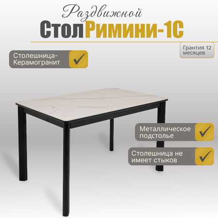 Стол Римини-1C с керамогранитом белый мрамор имеет торцевую раскладку с доводчиком только с одной стороны. Увеличивается стол на 45 см. В собранном виде, столешница без стыков. Столешница выполнена из МДФ - 22мм + PVC(плёнка ПВХ)+ керамогранит 5,5 мм Длина столешницы - 110 см Ширина столешницы - 70 см Длина столешницы в разложенном виде - 155 см Цельносварная металлическая царга, металлические, устойчивые опоры. Легкая сборка - только ножки прикрутить.