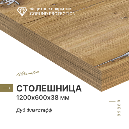Столешница Alternative Дуб Флагстафф 1200х600 мм добавит функциональности и стильный образ вашему интерьеру. Столешница подойдет для кухни, для ванной комнаты, для встраиваемой техники, для стола, для кухонного гарнитура, для барной стойки, для подоконника. Столешница выполнена из качественного материала. Это экологичная влагостойкая ЛДСП, которая обладает повышенной плотностью, что является гарантией увеличенного срока службы. Столешница не потеряет свой внешний вид на протяжении долгих лет интенсивной эксплуатации. Она облицована декоративным покрытием с защитным слоем Corund Protection с высокой степенью износостойкости. Corund Protection — это инновационная технология, которая обеспечивает повышенную защиту поверхности, а также устойчивость к бытовой химии, такой как уксусная кислота, кофе, дезинфицирующее средство, масло молоко. Выдерживает температуру до 150℃ при однократном взаимодействии. Кромка по периметру 1мм приклеена на ПУР клей и обеспечивает дополнительную защиту торцов от влаги. Материал столешницы: влдсп, Corund Protection Декор: Дуб Флагстафф Габариты: 1200x600x38 мм Закажите столешницу прямо сейчас и наслаждайтесь новым обликом вашей кухни.