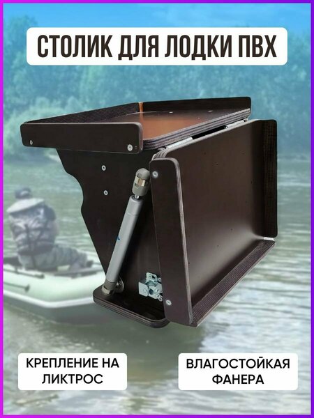 Столик предназначен для комфортного отдыха на воде. Крепится непосредственно на ликтрос. Сам стол раскладной. В сложенном виде размеры 265 х 195 (в разложенном виде 390 мм), высота 230 мм, высота бортика 20 мм, ящик под аккумулятор 180 х 65 мм. Материал: Влагостойкая фанера