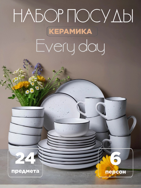 Представляем Вашему вниманию столовый набор из керамики «Every Day». В наборе вы найдёте всё необходимое для уютных семейных ужинов и праздничных обедов: - 6 кружки высотой 10 см, диаметром 8,5 см, объем 350 мл- идеальный вариант для утреннего кофе или вечернего чая. Они не только практичные, но и станут ярким акцентом на вашей кухне. - 6 десертные тарелки диаметром 20 см, высотой 2 см - прекрасное решение для подачи сладостей и фруктов. Они добавят изысканности вашему столу. - 6 обеденные тарелки диаметром 27 см, высотой 3,5 см - идеальный выбор для основных блюд. Они достаточно большие, чтобы вместить всё, что вы приготовили. - 6 суповые тарелки диаметром 15,4 см, высотой 6 см, объем 770 мл - прекрасно подойдут для подачи первых блюд. Они не только вместительные, но и стильные. Преимущества нашего столового набора: 1. Высококачественная керамика - материал, который отличается прочностью, долговечностью и устойчивостью к температурным перепадам. Ваша посуда будет радовать вас своим внешним видом долгие годы. 2. Стильный дизайн - набор посуды станет настоящим украшением вашего стола. Он добавит изысканности и уюта в ваш дом. 3. Практичность и функциональность - наш набор посуды идеально подходит для ежедневного использования. Он не только красивый, но и практичный. Не упустите возможность приобрести стильный и функциональный столовый набор посуды из качественной керамики! Он станет прекрасным дополнением к вашему интерьеру и порадует вас своим качеством и долговечностью. Хороших покупок!