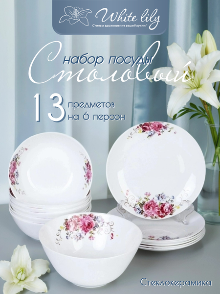 Набор столовой посуды из 13 предметов: «Розовая композиция» (евро) Этот набор столовой посуды станет вашим незаменимым помощником в сервировке как праздничных, так и повседневных обедов. Он включает в себя 13 предметов: салатник на 1100 мл, 6 тарелок диаметром 19 см и 6 порционных салатников на 550 мл, размером 15х6 см. Вся посуда выполнена в белом цвете из стеклокерамики, которая обладает визуальной схожестью с фарфором и высокой устойчивостью к механическим повреждениям. Этот материал позволяет создавать элегантные и простые композиции, которые будут прекрасно смотреться на любом столе. Кроме того, благодаря своей стеклокерамической основе, этот набор можно безопасно использовать в микроволновой печи и посудомоечной машине, что значительно упрощает процесс ухода за ним.
