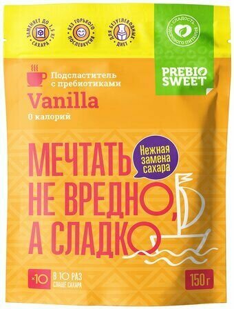 Сахарозаменитель Пребиосвит Ваниль создан для замены сахара в десертах и выпечке. Придает блюдам сладкий вкус и традиционный ванильный аромат сладкой выпечки. Не содержит калорий и углеводов. Экономно: в 10 раз слаще сахара. Мерная ложка в каждой упаковке. 1 упаковка 150 грамм заменяет 1,5 кг сахара! Снизить калорийность и сократить углеводы в рационе питания легко с ванильным подсластителем от бренда Пребиосвит. Для приготовления сырников, запеканок и других творожных и мучных десертов, сладких пирогов, тортов, булочек, сливочного крема и пр. Пребиосвит Ваниль содержит пребиотик лактулозу в профилактической дозировке, чтобы поддерживать комфортную работу желудочно-кишечного тракта. Состав: подсластитель эритрит, лактулоза, ароматизатор ванилин, подсластитель сукралоза.