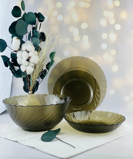 тарелки обеденные Ø 25 см 6 шт., тарелки глубокие (суповые) Ø 21 см 6 шт., тарелки десертные Ø 19 см 6 шт., салатник большой Ø 24 см