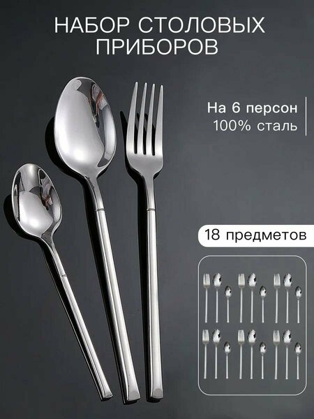 Представляем Вашему вниманию стильный подарочный набор столовых приборов 18 предметов на 6 персон серебристого цвета. Безупречная зеркальная полировка всех предметов ( 6 вилок, 6 чайных ложек, 6 столовых ложек). Современный дизайн для сервировки стола как в праздники, так и будние дни. Приборы изготавливаются из пищевой нержавеющей стали, не поддающейся коррозии, долговечны в эксплуатации. Эргономичная и изящная форма рукояток не останется не замеченым, удобство и комфорт ощущается сразу. Набор станет отличным подарком на любой праздник ( день рождения, Новый Год ), т. к. упаковано в двойную коробку для целостности приборов.