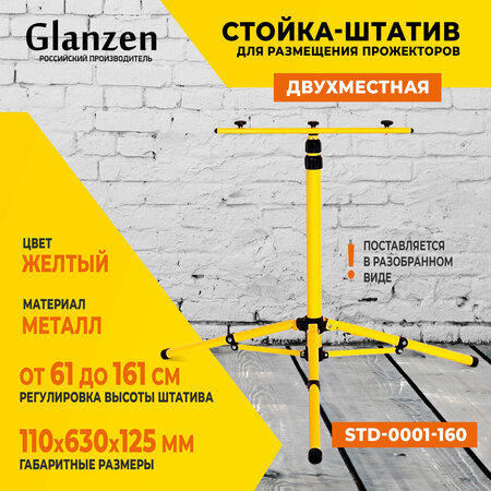 Двухместная стойка (штатив) для размещения и переноски двух и более прожекторов. Материал: металл Цвет: желтый Регулировка высоты: от 61 до 161 см Габаритные размеры: 110х630х125 мм Вес: 2,1 кг Поставляется в разобранном виде. Ассортимент представлен универсальными, адаптивными, в зависимости от модификации, стойками для фиксации всех типов прожекторов и светильников. Они предназначены для обеспечения дополнительной эргономики и удобства монтажа источников света. Стойки и кронштейны GLANZEN изготовлены из коррозиеустойчивых материалов и покрыты высокопрочным наружным покрытием, не подверженным агрессивному воздействию окружающей среды