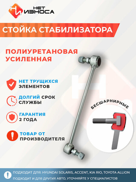 Запчасти для транспортных средств от “Нет износа” выпускаются из надежного и прочного материала, что обеспечивает длительный срок эксплуатации всех комплектующих. У нашей компании имеется патент №101119 на оригинальное решение “Стойки стабилизатора с полиуретановым упругим элементом”. Преимущества усиленной стойки В стойки стабилизатора “нетизноса” нет шарового шарнира — заменем на сайлентблок. В качестве эластомера мы используем полиуретан. Среди достоинств: