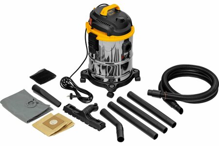 Тип пылесоса строительный Тип сухая уборка + сбор влажного мусора Тип питания сеть Модель пылесоса SVC15 Тип пылесборника мешок/контейнер Вертикальный нет Мощность 1200 Вт Объем бака 15 л Расход воздуха 30 л/с Разрежение 18 мбар Розетка для электроинструмента нет Пневморозетка нет Мощность встроенной розетки нет розетки кВт Тип аккумулятора нет Количество аккумуляторов в комплекте нет Емкость аккумулятора нет А*ч Уровень шума 85 дБ Возможность сбора жидкости есть Возможность работы без мешка есть Фильтр тонкой очистки (HEPA) F 9 Возможность влажной уборки есть Моющий нет Ранцевый нет Вес нетто 4.8 кг Напряжение 220 (230) В Длина всасывающего шланга 2 м Класс пыли L Функция выдувания да Преимущества Термозащита — в случае перегрева двигатель автоматически отключается, что предотвращает его поломку Влагозащита — внутренние компоненты надежно изолированы от попадания пыли и брызг воды по стандарту IP44 Функция выдува — пылесос можно использовать для очистки от мусора дорожек, ступеней, труднодоступных мест, а также для продувки деталей от пыли Удобная уборка в узком пространстве — в комплект поставки входит щелевая насадка, облегчающая удаление пыли из ящиков, шкафов, отопительных радиаторов и т д Автоматический контроль уровня жидкости при влажной уборке — как только количество воды в баке достигает предельно допустимого уровня, срабатывает предохранительный клапан и всасывание прекращается Широкий комплект поставки — к пылесосу прилагаются фильтры и мешки для мусора, в том числе многоразовый тканевый Мобильность — благодаря ручке и поворотным колесам пылесос удобно перемещать Комфортная работа — длина кабеля составляет 5 м, что позволяет свободно передвигаться по рабочей зоне Гарантия 3 года — высокое качество техники подтверждено производителем Комплектация: Пылесос - 1 шт Шланг-воздухопровод с адаптерами - 1 шт Коврово-половая насадка - 1 шт Изогнутая труба (ручка) - 1 шт Щелевая насадка - 1 шт Удлинитель - 3 шт HEPA фильтр - 1 шт Воздушный фильтр для сбора воды - 1 шт Бумажный мешок для мусора - 1 шт Тканевый мешок для мусора - 1 шт Поворотные колеса - 4 шт Верхняя ручка с крепежом - 1 шт Руководство по эксплуатации с гарантийным талоном - 1 шт Информация об упаковке: Единица товара: Штука Вес, кг: 4.8 Длина, мм: 290 Ширина, мм: 280 Высота, мм: 440