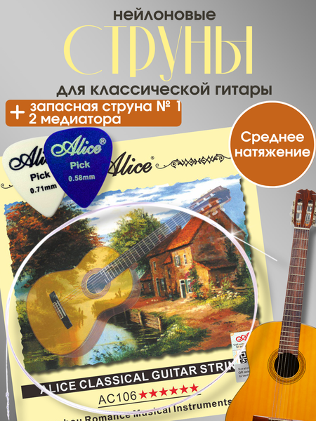 Струны для классической гитары - это сочетание мягкости, прочности и яркого звучания. Эти нейлоновые струны созданы для тех, кто хочет добиться идеального звука и максимального комфорта при игре. В комплекте 6 струн со средним натяжением и диаметрами 0.028 - 0.032 - 0.040 - 0.029 - 0.035 - 0.043 дюйма. Верхние три струны изготовлены из высококачественного нейлона, а нижние три из нейлоновой нити с обмоткой из посеребренной меди для насыщенного тембра и долговечности. В подарок — запасная первая струна, чтобы всегда быть готовым к ее замене. Также в комплекте есть два медиатора, которые станут приятным бонусом для любого гитариста. Мягкие струны на классическую гитару не только обеспечивают чистое и глубокое звучание, но и идеально подойдут для любого уровня мастерства — от начинающих музыкантов до профессионалов. Среднее натяжение Normal tension гарантирует стабильный строй и выразительные ноты в каждой композиции. Превосходное решение как для личного использования, так и в качестве подарка для гитариста. Почувствуйте качество каждой струны и откройте новые горизонты в своей игре! Выбирайте струны для классики Alice — надежные, созданные для вашего идеального звучания!