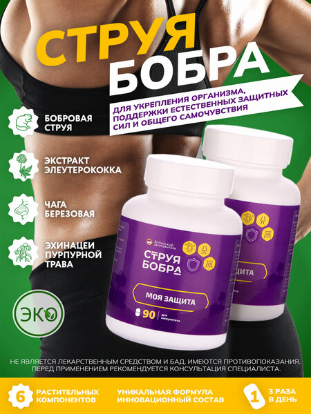 Экстракт бобровой струи (кастореум) – природный тоник для поддержания тонуса, жизненных сил и энергии, повышения выносливости после интенсивных физических и умственных нагрузок. Состав Струя бобра Моя защита 180 кап. (2 банки по 90 капсул): Экстракт струи бобра, мелкодисперсный порошок чаги березовой, эхинацеи пурпурной трава, экстракт корня элеутерококка. Способ применения Струя бобра Моя защита 180 кап. По 1 капсуле 3 раза в сутки. За 30 минут до приема пищи. Курс приема 3 недели.
