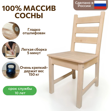 Стулья деревянные изготовлены из 100% массива сосны, очень прочные, выдерживают вес до 150кг. Гладко отшлифованы. От производителя. Производство Московская область, г. Химки. Гарантия 10 лет. Вы можете быть уверены в их экологичности и безопасности, так как они соответствуют европейскому стандарту EN71. Благодаря идеальному отклонению спинки 110 градусов на стуле очень удобно сидеть. Наши стулья разработаны с учетом вашего удобства. Ножки изготовлены из толстого бруса размером 40x40 мм, а сиденья изготовлены из прочного мебельного щита толщиной 18 мм. Для сохранения естественного рисунка древесины мы используем цельные ламели вместо срощенных. Сборка очень простая, без больших усилий, благодаря евровинтам, которые мы используем вместо обычных саморезов. Кроме того, наши стулья легко покрасить, они гладко отшлифованы под покраску. Всего за 5 минут на сборку вы сразу же будете наслаждаться своими новыми стульями! Массив сосны не боится влаги, дерево не рассыхается и не портится (в отличие от березы). Можно использовать во влажных помещениях и на открытом воздухе. Стулья подходят для использования на кухне, в гостиной, спальне, на балконе. А также на даче, в доме, на веранде. Глубина - 43 см Ширина - 40 см Высота - 95 см Высота спинки - 50 см Высота от сидения до пола - 45см