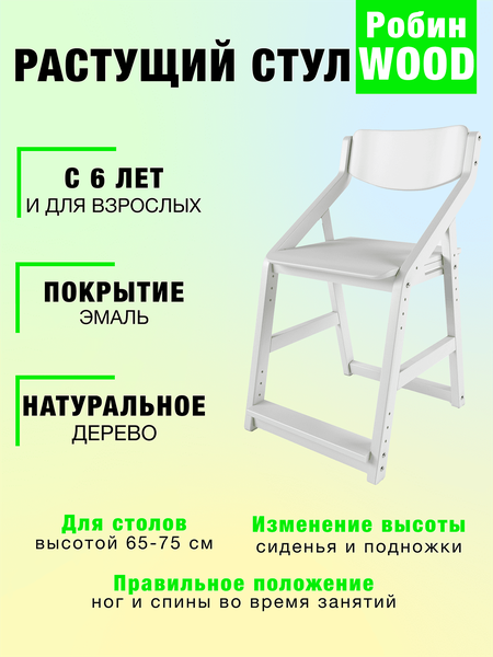 Растущий стул Робин Вуд для тедей от 6 лет. Пять положений регулировки высоты сиденья стула и подножки. Стул подходит как для полноценного рабочего стола, так и детского столика. Сиденье и спинка анатомической формы. Закругленные углы и устойчивость конструкции. Покрытие эмаль без запаха. Выдерживает вес до 100 кг. Дополнительные размеры: Регулировка сиденья по высоте на 5 положений: 510; 475; 444; 413; 382 мм Регулировка подножки на 5 положения (от пола):190; 165; 135; 105; 72 мм. Размер сиденья – 380*380 мм. Ширина подножки – 70 мм.