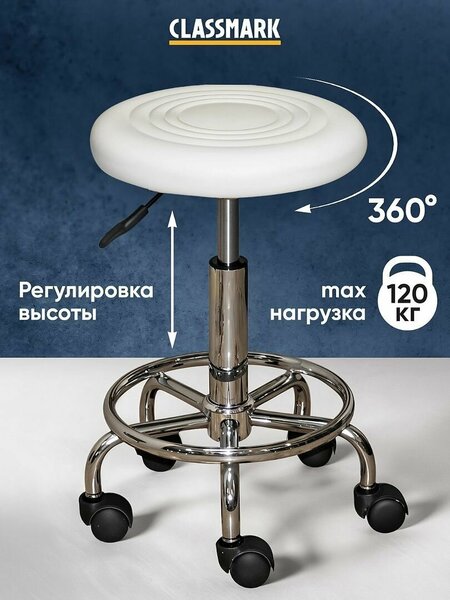 Стул мастера на колесиках Classmark мягкий, регулируемый, для мастера маникюра и педикюра, для наращивания ресниц, белый