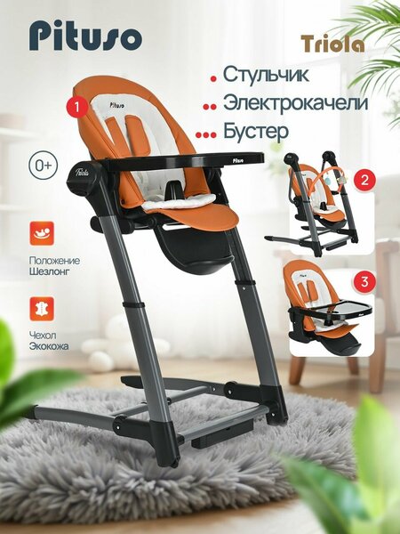 Pituso Triola - уникальный предмет мебели для ребенка с рождения, сочетающий в себе три варианта использования: электрокачели, стульчик для кормления и бустер. Стульчик прост в эксплуатации: легко трансформируется, передвигается, быстро складывается. Чехол выполнен из качественной экокожи. Столик состоит из двух частей, верхний поднос снимается, можно мыть в посудомоечной машине. Характеристики: • Три варианта использования: электрокачели, стул для кормления, бустер • Складная компактная рама • Съемный чехол из экокожи • Мягкий комфортный вкладыш • Регулируемая спинка • Регулируемое по высоте сидение • Регулируемая по высоте и длине подставка для ног, съемная • Стул оснащен колесами, обеспечивающими легкий ход • При складывании образуется дополнительная пара колес для легкой транспортировки стула в сложенном состоянии • 2 положения регулировки столешницы с подносом • 5-ти точечный ремень безопасности с мягкими накладками Комплектация: • Стул • Зарядное устройство • Ремни для крепления бустера • Дуга с игрушками • Пульт ДУ В положении качелей: Рекомендуемый возраст/вес: с рождения до 9 кг • Работает от сетевого адаптера (в комплекте) или батареек LR14 C 1.5V -4 шт (в комплект не входят) • 8 скоростей качания • Таймер с интервалами 15, 30, 60 мин • 15 стандартных мелодий и 5 мелодий со звуками природы • Регулировка громкости • Используется 2 крайних положения спинки • Стопор качания В положении стула: Рекомендуемый возраст/вес: с 6 месяцев до 3 лет (15 кг) • 5 положений наклона спинки • 7 положений по высоте сидения • 3 положения регулировки подножки по высоте и 2 по длине • 2 положения глубины столика Бустер используется путем установки на стандартный стул и крепления ремнями, которые идут в комплекте. Рекомендуется снять подножку. Максимальная нагрузка: 15 кг Рекомендуемый возраст: с рождения до 3 лет Размеры: 76х55х119 см Вес: 11.4 кг Размеры упаковки: 63х26х72 см Вес в упаковке: 12,8 кг