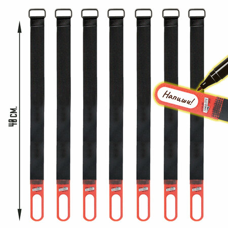 Набор из 7 качественных ремешков стяжек общей длиной 40см. и шириной 2см. В основании имеют надежную стальную скобу, так же на конце стяжки имеется белое поле для заметок. Изготовлены из полиэстера. Каждую стяжку можно подписать ручкой, карандашом или маркером. Незаменимый и надежный помощник в организации порядка и фиксации различных предметов. Пригодятся как в домашнем быту и хозяйстве - хранение кабелей, проводов, зарядок, прочих мелких бытовых предметов, инструмента, бытовой техники. Так и для активного отдыха - хранение и фиксация удочек, спиннингов, туристического оборудования и предметов для отдыха как в дороге так и на природе.