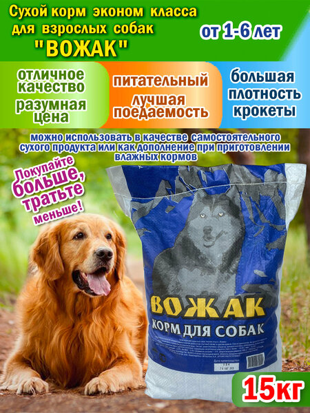 Представляем Вашему вниманию сухой корм "Вожак" - это корм эконом класса для взрослых пород собак. Он выгодно отличается от других кормов достойным качеством по отношению к низкой цене. Питательный и приятный вкус. Изготовлен из мясо растительного сырья. Состав: злаки (дробленная пшеница, кукуруза) 64% мясные субпродукты: мука мясокостная - 22%, мука рыбная - 3%, растительный жиры (очищенное подсолнечное масло) животные жиры (свиной, говяжий или куриный) 8-10%, дрожжи кормовые. Ваш любимый питомец обязательно останется довольным.