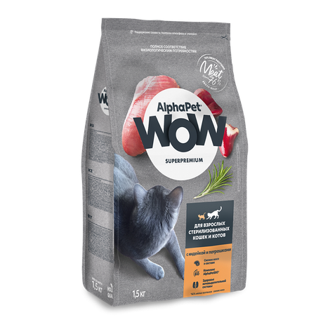 Сухой полнорационный корм с индейкой и потрошками для взрослых стерилизованных кошек и котов с индейкой и потрошками 76% мясного белка Свежее мясо в составе Низкое содержание жира и оптимальный уровень клетчатки помогают ограничивать набор избыточного веса Баланс магния, кальция и фосфора для здоровья мочевыделительной системы Высшая категория качества Holistiс (холистик) Натуральные ингредиенты Не содержит ГМО, искусственных красителей и ароматизаторов Ингредиенты, пригодные в пищу человеку, уровня Human Grade Бережная технология, сохраняющая вкусовые и питательные свойства свежего мяса Уникальный комплекс натуральных добавок AlphaPetBIO®