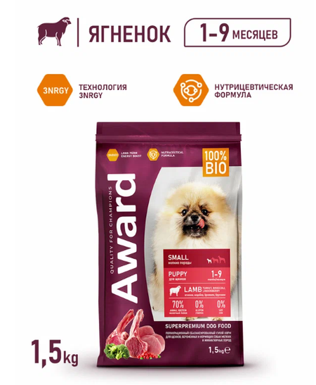 Сухой корм AWARD для щенков, беременных и кормящих сук мелких и миниатюрных пород с ягненком и индейкой с добавлением брокколи и брусники. Технология 3NRGY используется при изготовлении корма, сочетая полезные углеводы, что дает длительный запас энергии и чувство сытости. Обогащен полиненасыщенными жирными кислотами, которые повышают качество шерсти и укрепляют иммунитет. Пробиотики и пребиотики в составе корма помогают сохранять естественный баланс кишечной микрофлоры и способствуют оптимальному усвоению питательных веществ. В состав добавлена брокколи – отличный источник клетчатки, улучшающий работу ЖКТ. Без красителей и консервантов, что делает корм безопасным и полезным для вашего питомца. Вес упаковки составляет 1,5 кг, что обеспечивает длительное использование. Тип упаковки – пакет, что обеспечивает удобство хранения и использования корма. Тип корма – сухой, что позволяет легко контролировать количество корма, необходимого для вашего питомца. Возраст животного – щенки (до 1 года), беременные и кормящие суки. Основной ингредиент – мясо ягненка и птицы, что делает корм вкусным и питательным. Особые потребности – для беременных и кормящих сук, что обеспечивает дополнительную поддержку в этот важный период. Выбирая сухой корм AWARD для щенков, беременных и кормящих сук мелких и миниатюрных пород, вы обеспечиваете своему питомцу здоровое питание, заботу о его шерсти и иммунитете, а также удобство использования и хранения.