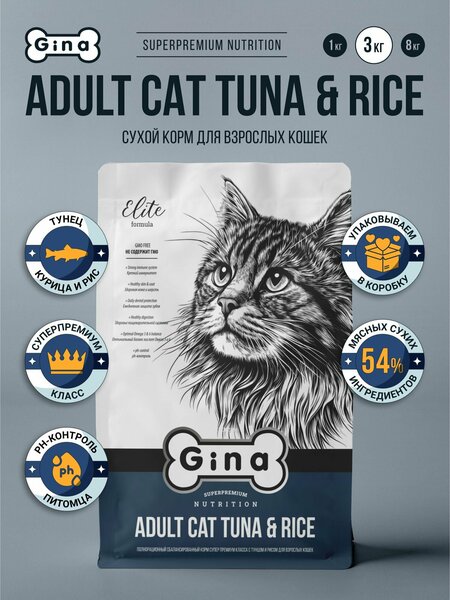 Gina Classic Adult Cat Tuna & Rice Полнорационный сбалансированный корм супер премиум класса с тунцом и рисом для взрослых кошек Рекомендован для взрослых кошек с нормальным уровнем активности. Высокое содержание двух видов клетчатки, дающее длительное ощущение сытости и нормализующее работу пищеварительной системы, наряду с умеренной жирностью корма, препятствуют набору лишнего веса, сохраняя при этом мышечную массу. Таурин и жирные кислоты Омега-3 и Омега-6 благотворно влияют на зрение, сердечно-сосудистую систему и когнитивную функцию. рН-контроль.