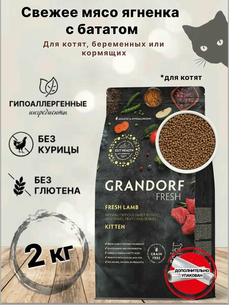 Свежее мясо ягненка С бататомдля котят Беззерновой корм с живыми пробиотиками. Для котят от 3 недель, беременных и кормящих кошек. Идеально сбалансированная формула на основе свежего мяса ягненка богата всеми белками, жирами и витаминами необходимыми для гармоничного роста и развития котенка и отвечает всем особым потребностям растущего питомца. Благодаря гипоаллергенным ингредиентам, беззерновому составу, отсутствию глютена, корм имеет отличную усвояемость и высокую пищевую ценность.