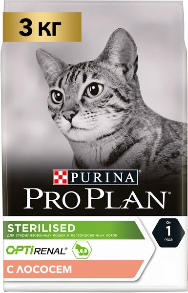 Сухой корм Purina Pro Plan Sterilised (After Care) с лососем для кастрированных котов и стерилизованных кошек содержит все необходимые питательные вещества, витамины и микроэлементы. Рецепт корма разработан ведущими ветеринарными врачами и диетологами таким образом, чтобы обеспечивать все потребности кастрированных кошек. Комплекс OptiRenal содержит антиоксиданты, аминокислоты и аргинин, а также способствует контролю правильного уровня PH в моче, и, как следствие, защищает систему МКБ. Особенности Защита системы МКБ Подходит для кастрированных и стерилизованных кошек и котов. Показатели мочи ОПН и КПА поддерживаются на недонасыщенном или низком метастабильном уровне для струвита и оксалата кальция. Высокое содержание белков в сочетании с низким сочетанием углеводов. Механическая гигиена полости рта. Защита зубов и десен. Омега-3 кислоты для кожи и шерсти Состав Лосось (20%), сухой белок птицы, рис, кукурузный глютен, пшеничный глютен, кукуруза, пшеничные волокна, яичный порошок, минеральные вещества, животный жир, консерванты, вкусоароматическая кормовая добавка, дрожжи, витамины, рыбий жир, антиоксиданты. Анализ Белки 41% Медь 12 мг/кг Жиры 12% Марганец 36 мг/кг омега-3 жирные кислоты 0,7% Цинк 144 мг/кг омега-6 жирные кислоты 1,6% Селен 0,12 мг/кг Сырая зола 7% Витамин А 35 000 МЕ/кг Сырая клетчатка 5% Витамин D3 1100 МЕ/кг Железо 77 мг/кг Витамин Е 670 МЕ/кг Йод 1,9 мг/кг Витамин С 140 мг/кг Норма кормления. Норма кормления указана приблизительно и может отличаться в зависимости от активности, уровня и качества жизни Вашей кошки или кота. Важно – при кормлении сухим кормом следует обеспечить постоянный доступ к свежей и чистой воде Вес тела (кг) Суточное кол-во корма (г) 2 – 4 30 – 60 4 – 6 60 – 90 6 – 8 90 – 120