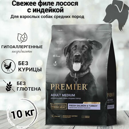 Premier Dog Adult Salmon&Turkey Medium – сухой корм супер премиум класса для взрослых собак средних пород со свежим филе лосося с индейкой. Для взрослых собак средних пород с нормальной активностью, чувствительным пищеварением или склонных к аллергии. Свежее гипоаллергенное и питательное мясо индейки благотворно влияет на пищеварительную систему собаки. Благодаря монопротеиновой формуле, гипоаллергенным ингредиентам, одному виду зерновых, отсутствию глютена, корм имеет отличную усвояемость, высокую пищевую ценность и помогает оставаться вашему питомцу здоровым и жизнерадостным на протяжении долгих лет жизни.