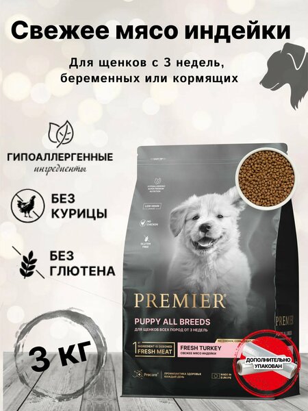 Сухой корм для собак Premier Dog Turkey PUPPY (Свежее мясо индейки Для щенков всех пород с 3 недель, беременных и кормящих собак) 3 кг