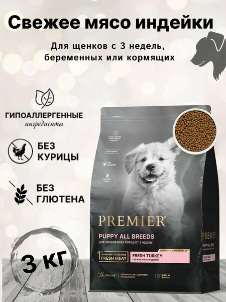 Сухой корм для собак PREMIER Dog Turkey Puppy – сухой корм супер премиум класса для щенков всех пород со свежим мясом индейки. Для щенков всех пород с 3 недель, беременных и кормящих собак Полнорационный сухой корм супер-премиум класса на основе свежего мяса индейки для щенков всех пород с 3-недельного возраста, беременных и кормящих собак. Тщательно подобранные и прекрасно сбалансированные ингредиенты отвечают всем особым потребностям растущего питомца. Идеально подойдет питомцам склонным к аллергии, поможет укрепить иммунитет и улучшить состояние шерсти и кожи.