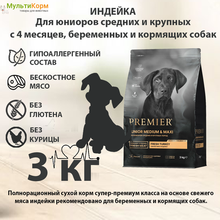 Сухой корм для юниоров средних и крупных пород с 4-х месяцев, беременных и кормящих собак,3 кг Premier Dog Turkey JUNIOR Medium&Maxi, супер-премиум, гипоаллергенный
