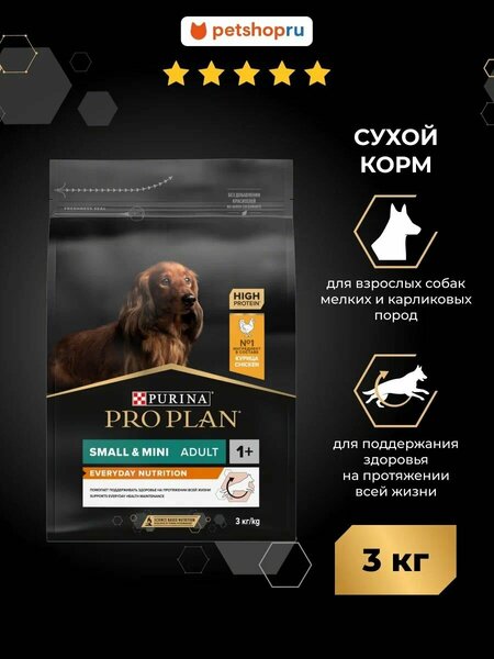 Сухой корм PRO PLAN для взрослых собак мелких и карликовых пород, с высоким содержанием курицы, EVERYDAY NUTRITION, 3кг