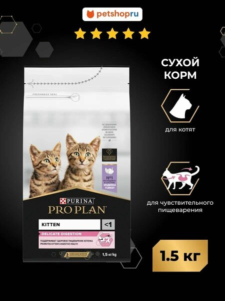 Сухой корм PRO PLAN Kitten DELICATE DIGESTION для котят с чувствительным пищеварением, с высоким содержанием индейки, 1.5 кг