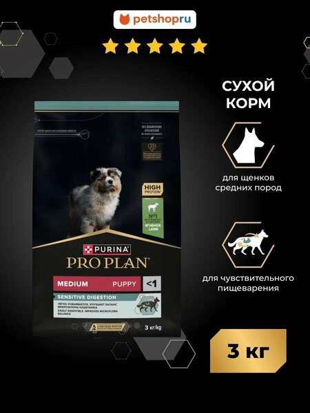 Сухой корм PRO PLAN для щенков средних пород с чувствительным пищеварением, с высоким содержанием ягненка, SENSITIVE DIGESTION, 3кг