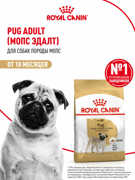 Корм сухой полнорационный для собак - Специально для взрослых собак породы мопс в возрасте 10 месяцев и старше PUG ADULT (МОПС ЭДАЛТ) ROYAL CANIN®, подходящий для собак породы мопс в возрасте от 10 месяцев, специально разработан с учетом потребностей вашей собаки в питательных веществах.