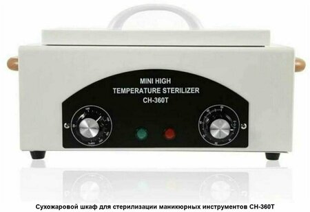 Сухожар предназначен для дезинфекции маникюрных и педикюрных инструментов до процедуры, а также для чистки после. Внутренняя конструкция из нержавеющей стали долговечна и устойчива к ржавчине. Световой индикатор позволяет регулировать температуру стерилизатора от 0 до 200 градусов. Таймер позволяет контролировать время стерилизации, которое определяется в зависимости от степени загрязнения и материала, из которого изготовлен инструмент. Сухожаровой шкаф CH-360T особенно ценится среди мастеров бьюти-индустрии за счет своей долговечности и надежной работы. Стерилизатор для маникюрных инструментов - необходимый инструмент для каждого мастера и салона.