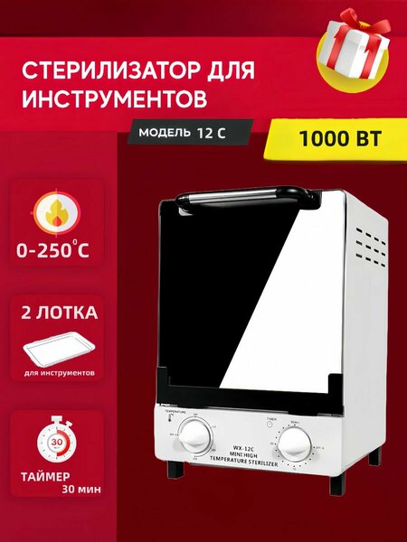 Стерилизатор для инструментов Сухожаровой шкаф WX-12C Sanitizing Box для дезинфекции маникюрных и педикюрных инструментов. Прибор для стерилизации представляет собой сухожар с возможностью нагрева до 250°С. Сухожаровой шкаф для стерилизации инструментов, медицинских и педикюрных принадлежностей имеет несколько режимов работы и таймер. Сухожар великолепно борется с различными видами бактерий и обеспечивает полную безопасность клиентов. Воздушный стерилизатор дезинфицирует инструменты за счет высокой температуры. Работа с нашим профессиональным стерилизатором маникюрних инструментов не вызовет трудностей даже у новичков. Всё, что нужно - это положить медицинские, педикюрные, стоматологические или маникюрные инструменты в крафт пакет и отправить в ящик для стерилизации. После завершения процесса стерилизации издается сигнал. Внутренний термический блок стерилизатора для маникюра изготовлен из нержавеющей стали. Внутри аппарата для стерелизации есть съемный контейнер для хранения, переноски и стерилизации косметологических инструментов. Благодаря наличию таймера, можно держать под контролем весь процесс стерилизации и регулировать, создавая подходящий режим. Диапазон времени составляет от 0 до 30 минут. Сухожар стерилизатор имеет мощность 1000 вт. Таймер Стерилизатор косметологический и световой индикатор позволят регулировать температуру стерилизатора от 0 до 250С. Необходимо инструменты поместив в крафт-пакеты, положить в сухожаровой аппарат на 1 час с температурой 180 градусов, для того чтобы индикатор сменил цвет. (Если цвет не поменялся, но сухожар нагрелся, значит дело в крафт пакетах, а не в сухожаре). Технические характеристики: Терморегулятор: от 0 до 250С Мощность: 1000 Вт . Помимо использования воздушного стерилизатора в кабинетах стоматолога, визажиста, мастеров маникюра, педикюра и медицинских организаций, сухожар можно купить для применения в домашних условиях( для стерилизации детских бутылочек, сосок, посуды и других вещей).