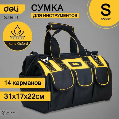 Сумка для инструментов DELI DL430113 310x170x220мм, ткань Oxford,14 карманов 98479 используется для хранения и транспортировки инструмента, хранения малярных и отделочных инструментов, прекрасно подходит для похода на рыбалку и даже в качестве сумки для фитнеса! Сумка выполнена из качественной и прочной ткани Oxford, благодаря чему не боится влаги и пыли. Невероятно вместительная - 14 карманов и объёмное основное отделение. Основание сумки оснащено стальными прутами, что придает дополнительную прочность и защиту от деформации. Прочные удобные ручки обеспечивают комфортную носку. В комплекте поставляет дополнительный ремень для ношения на плече.