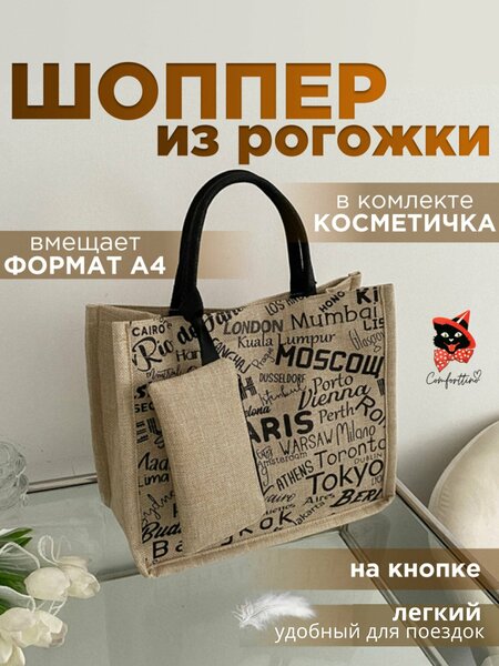 Лето - время отдыха и ярких впечатлений! Идеальным спутником для летних прогулок, поездок на пляж и увлекательных путешествий станет наша стильная и функциональная женская сумка шоппер через плечо. Изготовленная из натурального текстиля, такого как холщовая ткань, эта сумка обладает прочностью и долговечностью. Прочные ручки не только обеспечивают удобство носки, но и придают ей элегантный вид. Наш шоппер идеально подойдет для городских прогулок, пляжного отдыха, рабочих будней или учебы. Внутри сумки есть удобный карман на молнии, который поможет вам организовать хранение мелочей и сохранить порядок. Благодаря просторному размеру, сумка легко вмещает формат А4, позволяя без проблем разместить ноутбук, планшет, телефон и другие необходимые вещи. Дизайн сумки украшен стильным « газетным» принтом. Ровные швы и качественная фурнитура гарантируют долговечность и надежность сумки. Вы можете использовать ее в повседневной жизни, не беспокоясь о том, что она порвется. Наш шоппер сохраняет форму и предлагает различные варианты носки - на плече, через плечо или в руках. Позвольте себе быть стильной и уверенной в любой ситуации с нашей универсальной сумкой шоппер!
