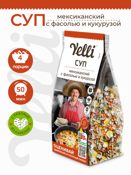 Мексиканский суп от бренда Yelli – ароматный, в меру острый и сытный суп с фасолью, чечевицей и сладкой кукурузой. Подайте его с тортильей или начос и окунитесь в кулинарный колорит яркой мексиканской кухни. Готовая смесь для приготовления мексиканского супа позволит без лишних хлопот приготовить ароматный согревающий густой Мексиканский суп. Она не нуждается в промывании и предварительном замачивании. Подав его с тортильей или начос, вы получите сытный обед. Такой суп можно приготовить дома, на даче, в походе, ведь правильное полноценное питание необходимо всегда и везде. Суповая смесь от Yelli – это 100% натуральный продукт, не содержащий соли и ГМО. В основе этого бакалейного продукта – богатые белком чечевица и фасоль, кукуруза, сушеные овощи и целый набор трав и специй. Мексиканский суп отлично дополняет веганский, диетический, вегетарианский рацион питания. Его непременно по достоинству оценят люди, занимающиеся спортом, ведущие здоровый образ жизни и придерживающиеся правильного питания (ПП). Это оригинальная идея для подарка по поводу или в качестве знака внимания и заботы.