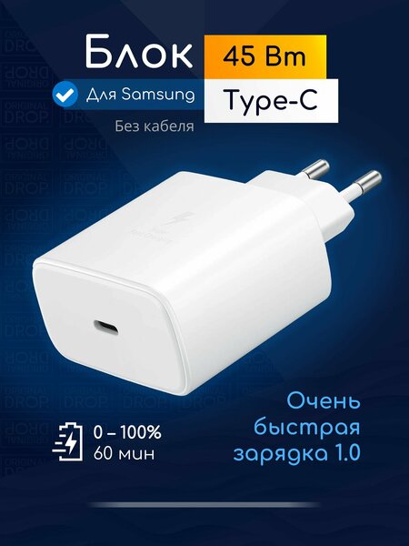 Original Drop представляет блок питания Type С мощностью 45W для быстрой зарядки телефонов Samsung и других устройств на базе Андроид. ✅ Без кабеля. Вы получите сетевое зарядное устройство 45 Вт с 1 разъемом Type-C. Провод в комплект не входит. ✅ Мощный. Поддерживаются технологии Super Fast Charging (SFC 1.0), Quick Charge (QC 2.0 и 3.0), Power Delivery (PD 3.0), PPS, Mi Turbo Charge, Huawei FCP и SCP. Заряжает быстрее обычного блока на 25W. ❗ Важно понимать перед покупкой, что не все телефоны и кабели поддерживают быструю зарядку. Также эта функция может быть отключена у вас в настройках. В таких случаях адаптер будет работать в обычном режиме. ✅ Универсальный. Зарядка подходит для телефонов Samsung Galaxy (S25, S24, S23 Ultra / FE, А55, А54, А35, А15 и других моделей), Андроид планшетов. Совместима с гаджетами других производителей, имеющими порт Type-C: Apple (iPhone 16 и 15 Pro Max, новые модели iPad), Xiaomi, Redmi, Poco, Honor, Huawei, Google, OPPO, OnePlus, Realme, VIVO, Meizu, Infinix, TECNO, Nubia, ZTE. ✅ Технологичный. Блок определяет поддерживаемые устройством режимы зарядки и автоматически регулирует подачу тока для сохранения ресурса батареи. ✅ Безопасный. Встроенная защита от перегрева, перезаряда батареи, короткого замыкания, перегрузки по току, скачков напряжения и перенапряжения гарантирует стабильную работу устройства в любых условиях. ✅ Долговечный. Адаптер изготовлен из ABS-пластика, устойчивого к царапинам и нагреву. Будет выглядеть аккуратно и прослужит долго, даже при ежедневной эксплуатации. ✅ Оригинальный дизайн. Выполнен в минималистичном стиле модели EP-TA845 и классическом белом цвете. ✅ Практичный. Этот небольшой адаптер на 45 Ватт можно брать с собой повсюду: он легко помещается даже в кармане. Подходит для путешествий благодаря поддержке широкого диапазона входного напряжения от 100 до 240 В. Зарядник USB-C 45W PD Adapter от Original Drop поставляется в фирменной коробочке и идеально подходит для гаджетов Самсунг Галакси.