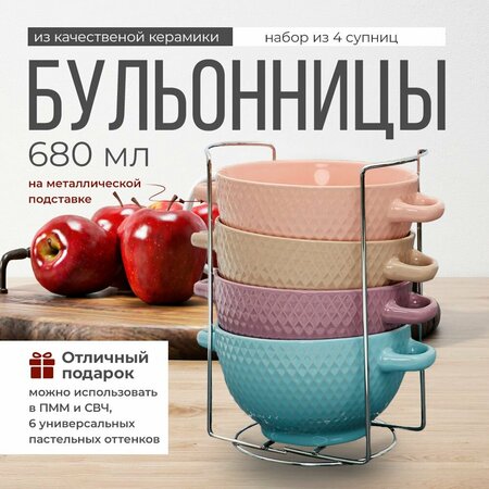Представляю вашему вниманию уникальный набор керамической посуды для сервировки и подачи супов. Каждая бульонница выполнена из качественной керамики и прослужит вам долгие годы Эта посуда станет незаменимым помощником на вашей кухне. Благодаря удобным ручкам вы сможете легко и безопасно перемещать посуду, не опасаясь обжечься горячим содержимым. Кроме того, форма каждого из предметов обеспечивает идеальную подачу блюд на стол. Керамическая посуда имеет не только практическую функцию, но и служит стильным элементом декора вашей столовой. Ее элегантный дизайн и нежный цвет добавят изысканности и шарма вашему сервированному столу. Супницы являются глубокими мисками, что позволяет вместить большое количество супа, холодца или бульона. Благодаря этому вы сможете насладиться изысканными блюдами вместе с вашей семьей и гостями. Этот набор керамических супниц из 4 штук на металлической подставке идеально подойдет для ежедневного использования на кухне или для особенных случаев, таких как праздничные ужины или приемы гостей. Купив этот набор, вы получаете надежный и стильный набор глубоких тарелок для подачи самых вкусных и аппетитных супов.