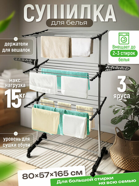 Сушилка 3-х ярусная "Серебристо-черная" 80*57*165 см, напольная на колесиках с ограничителем, с 7-мью перекладинами на каждом ярусе, с 2-мя отделениями для вешалок с рубашками, с полкой для сушки обуви, максимальная нагрузка до 9 кг, при равномерном распределении нагрузки по ширине, металл/полипропилен