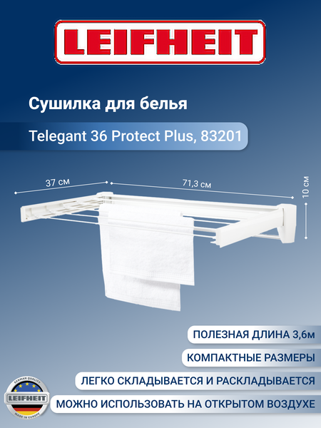 Сушилка для белья Leifheit Telegant Plus 70: - рабочая длина 3.5 м; - 5 выдвижных струн из стали с порошковым покрытием; - сушилка устойчива к ржавчине; - идеальна для размещения в ванной комнате, на кухне или балконе; - крепежные детали прилагаются; - выдерживает 2 кг белья; - имеет дополнительный стержень из аллюминия. который можно использовать в качестве компактного полотенцесушителя; - современный дизайн сочетается с превосходным качеством материалов.