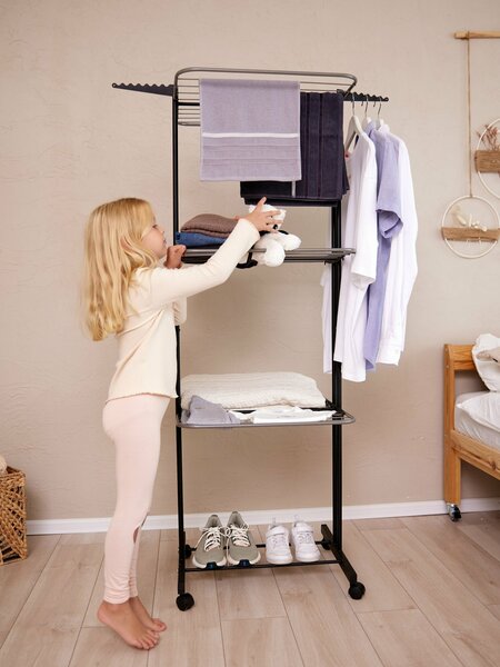 Вертикальная сушилка для одежды, полностью изготовленная из металла, рассчитана на 60 кг белья. Гораздо прочнее приспособлений с креплениями и деталями из пластика. Уникальный держатель с эффектом рычага выдерживает большой вес. Компактные размеры позволяют использовать ее не только в гостиной или коридоре, но также в ванной или на балконе. В отличие от потолочных или настенных моделей не требует установки и порчи стен. Благодаря колесикам легко перемещается, намного проще, чем раскладные напольные. Колеса вращаются на 360 градусов и не царапают пол. Трехъярусная модель вмещает намного больше белья. Оснащена боковыми вешалками для плечиков. В свободное от сушки время можно использовать как этажерку или стеллаж в прачечной, для хранения корзин, полотенец или стопок высохших вещей. Складные полки дают возможность компактного хранения в прихожей или кладовке. Полочки при необходимости вынимаются. Внизу есть отделение для сушки обуви. Металлические планки расположены на расстоянии 6 см друг от друга. Белье без отжима рекомендуется развешивать в шахматном порядке. Вмещает 4 стирки. Сварные боковые штанги покрыты противоскользящей эмалью. Большие вещи, такие как пледы и пододеяльники, можно при сушке перекинуть через перегородку. Большая многоуровневая конструкция незаменима для большой семьи. Может стать отличным подарком новоселам или хозяйкам на любой праздник.